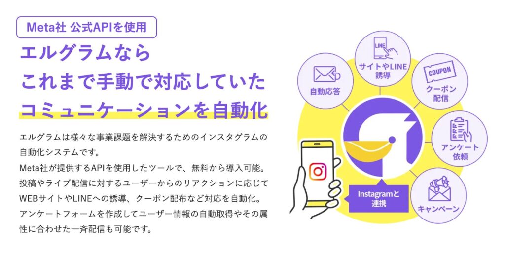 エルグラムは、Meta社公式API(外部のアプリケーションと連携するための公式な仕組み)を使用したInstagramの自動化ツールです。