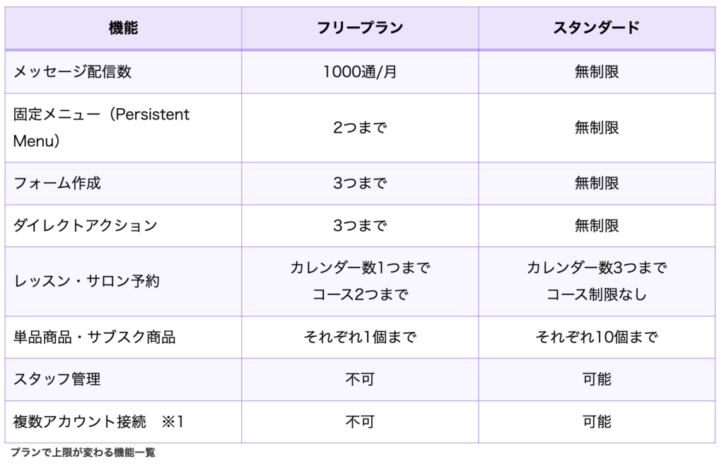 メッセージ配信数が無制限になるほか、固定メニューやフォーム作成、ダイレクトアクション(ボタンクリックなどの特定のアクションをユーザーに促す機能)などの機能も制限なくご利用いただけます。