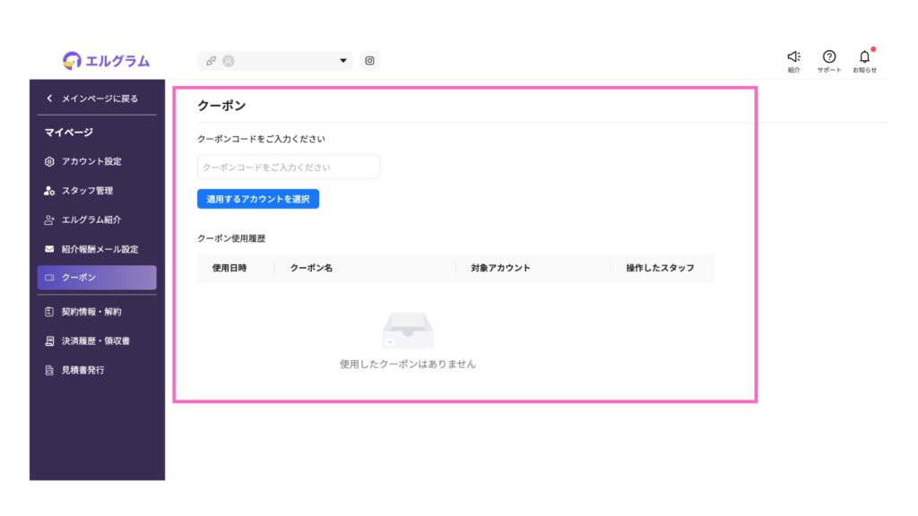 株式会社ミショナが発行するクーポンコードを入力することで、エルグラムの有料プランをよりリーズナブルにご利用できます。対象のコードをお持ちの場合、専用画面に入力するだけで特典が適用されます。