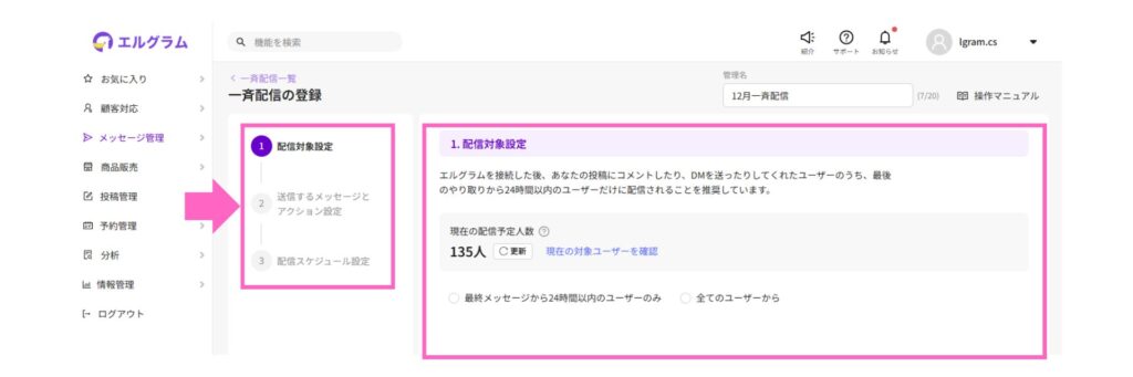 今回のアップデートでは、配信対象の選択、メッセージ内容の設定、配信条件の確認といった操作を、画面の案内に沿って順番に進めることで、スムーズに配信準備を行えるようになりました。