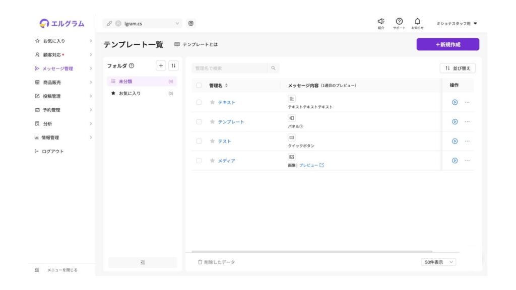 テンプレート管理画面は、サイドメニューの「メッセージ管理」から「テンプレート」を選択することでアクセスできます。