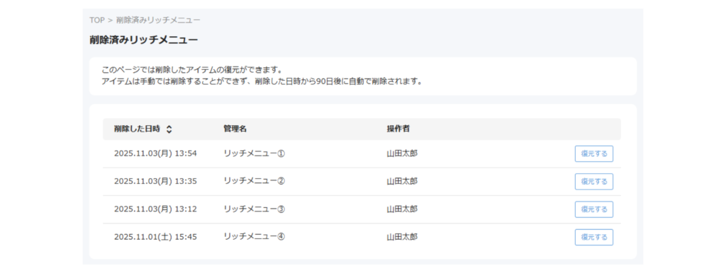 これまでは、削除操作を行うと即座に完全削除されていましたが、 本機能の追加により、削除後も90日間は復元可能な状態で保管されるようになりました。 なお、保管期間を過ぎたリッチメニューは自動的に完全削除されます。
