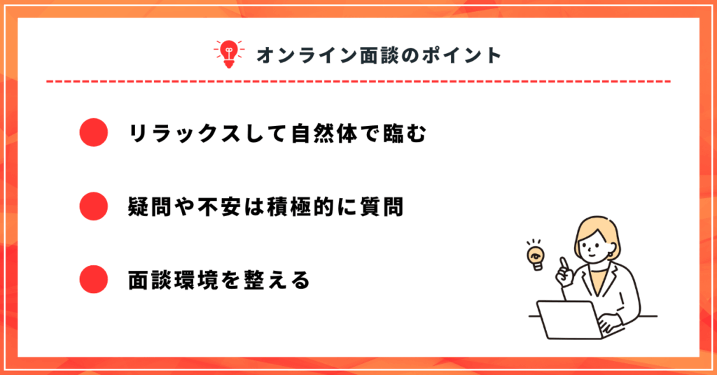 オンラインでの面談となりますので、事前に通信環境や、カメラ・マイクの動作を確認しておくとスムーズです。