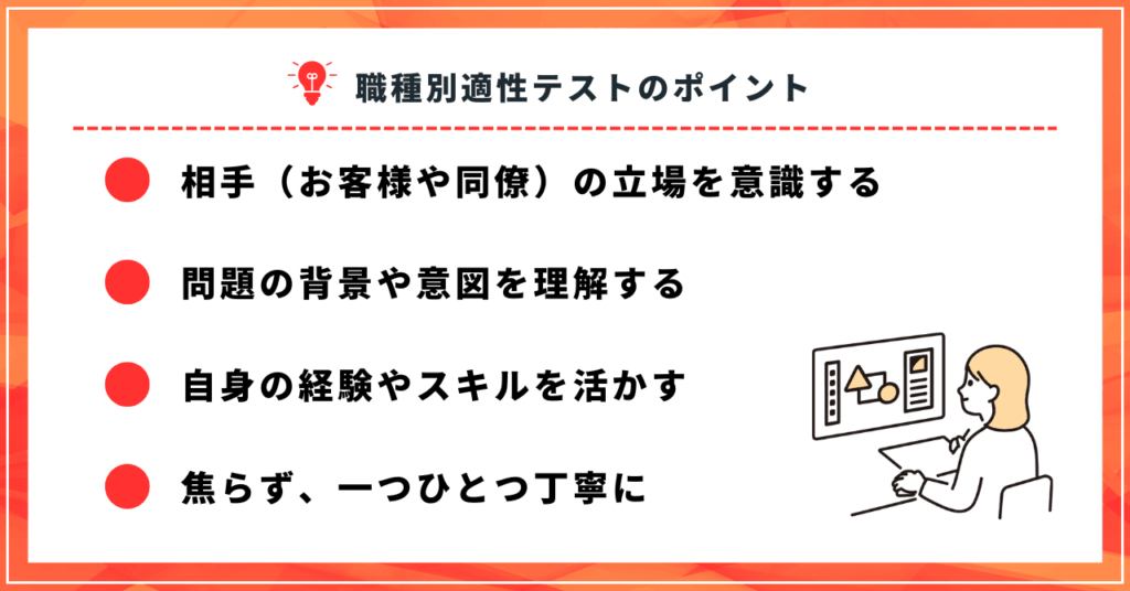 職種別適性テストは、応募者の皆さまが「実際のお仕事を想定した状況」でどのように対応できるかを確認する大切なステップです。
